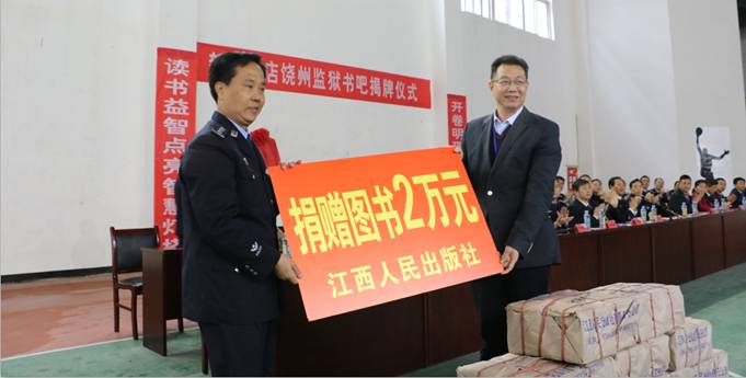 儀式期間,江西人民出版社社長張德意代表人民社向饒州監(jiān)獄服刑人員現(xiàn)場捐贈共計600冊、價值2萬多元的圖書,其中既有高品質(zhì)的學(xué)術(shù)研究著作、理論讀物,也有較高水平的文學(xué)作品、暢銷圖書。張德意希望這些圖書能夠滿足服刑人員閱讀需要,通過閱讀知識使服刑人員讓生命重生,讓生活重塑,讓人活得充實、活得有尊嚴,做一個有道德的人。